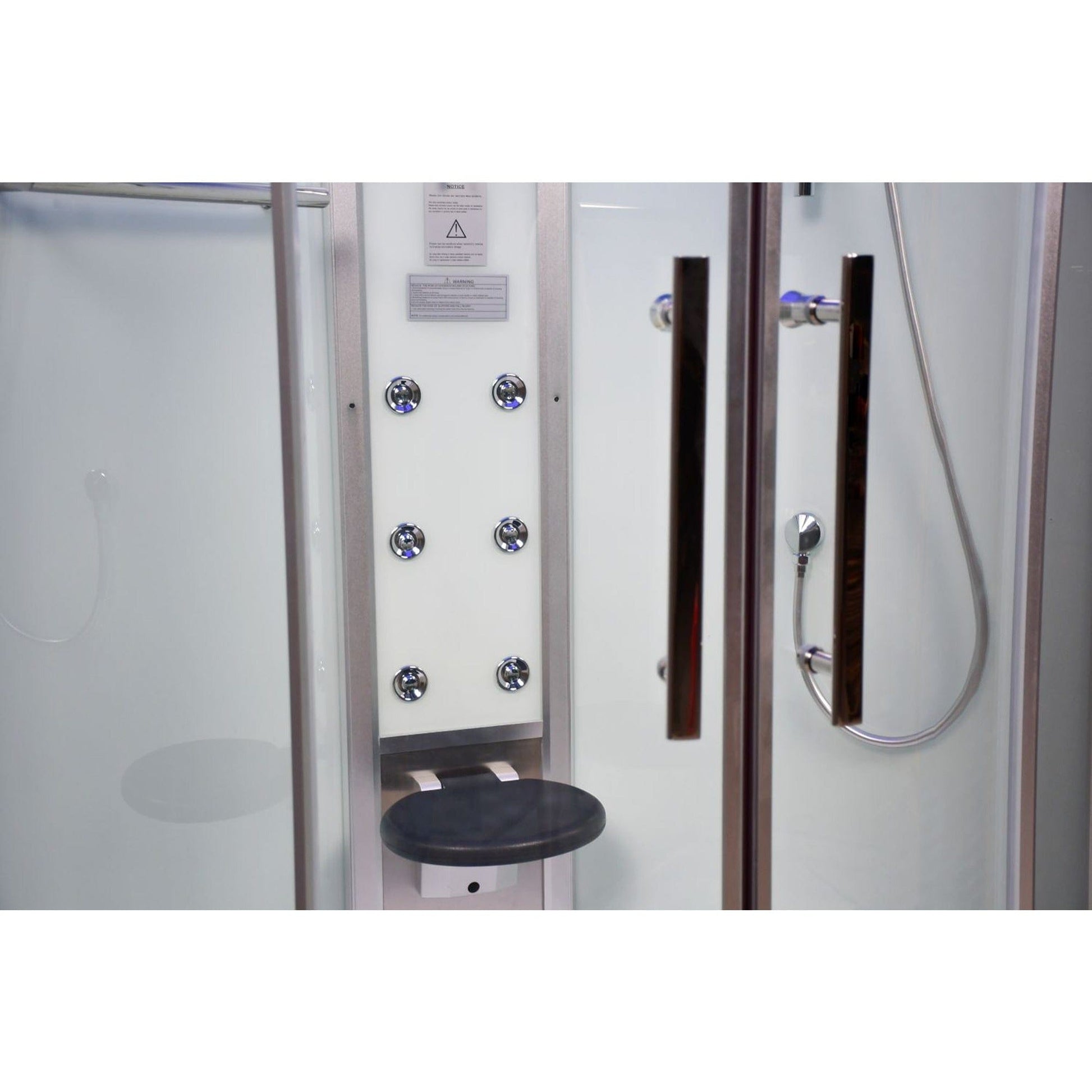 The Platinum DZ901A corner steam shower combines luxury with modern convenience. Dual sliding doors provide entry into this well acquainted steam shower with 6 adjustable body massage jets, overized ceiling shower with color changing lights and an adjustable handheld shower wand. The seat conveniently folds up for even more space. The 3kW steam generator gets the steam up to 120 degrees Farenheit in just minutes! This shower features clear front glass with white back glass and nickel trim to provide a stylicsh flare to any contemporary bathroom. A 42" x 42" cabin provides ample room for 1 person.